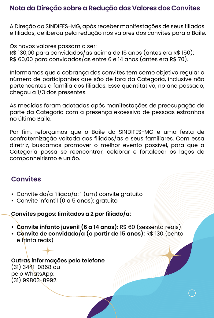 A Direção do SINDIFES-MG, após receber manifestações de seus filiados e filiadas, deliberou pela redução nos valores dos convites para o Baile.