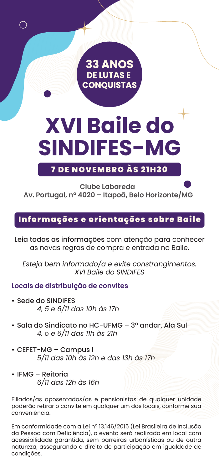 Por fim, reforçamos que o Baile do SINDIFES-MG é uma festa de confraternização voltada aos filiados/as e seus familiares. Com essa diretriz, buscamos promover o melhor evento possível, para que a Categoria possa se reencontrar, celebrar e fortalecer os laços de companheirismo e união.